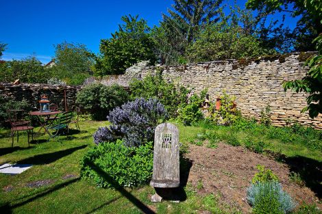 C'est un Jardin poétique et romantique parsemé de massifs floraux, de murs en pierres sèches et d'objets clairsemés qui entoure la maison et ses terrasses.