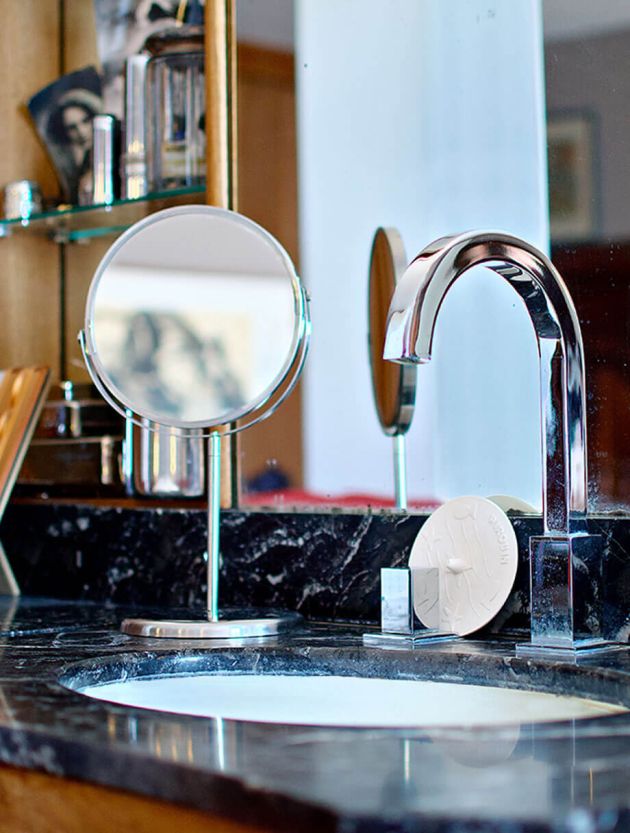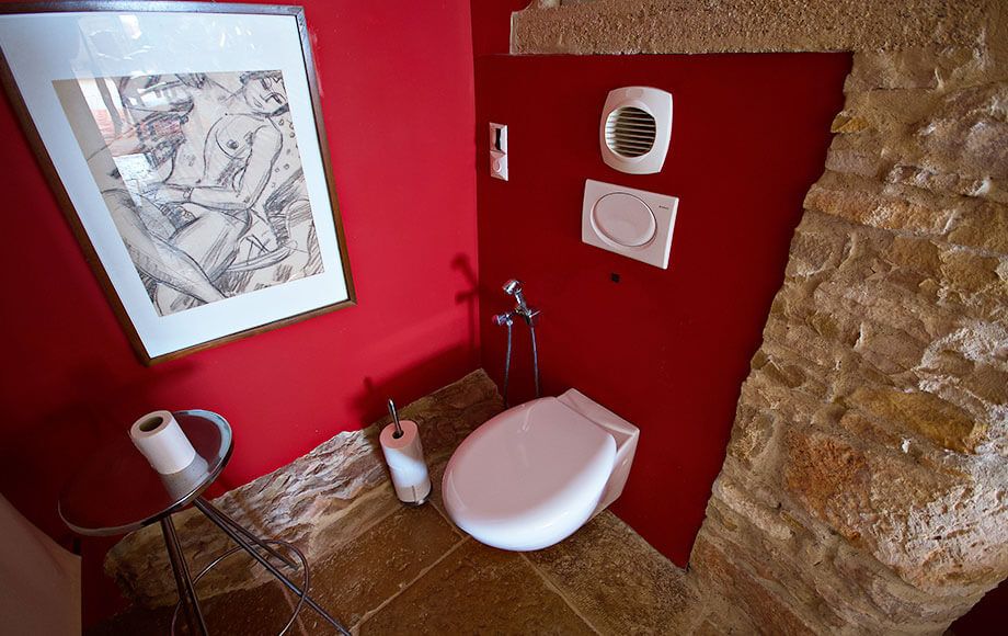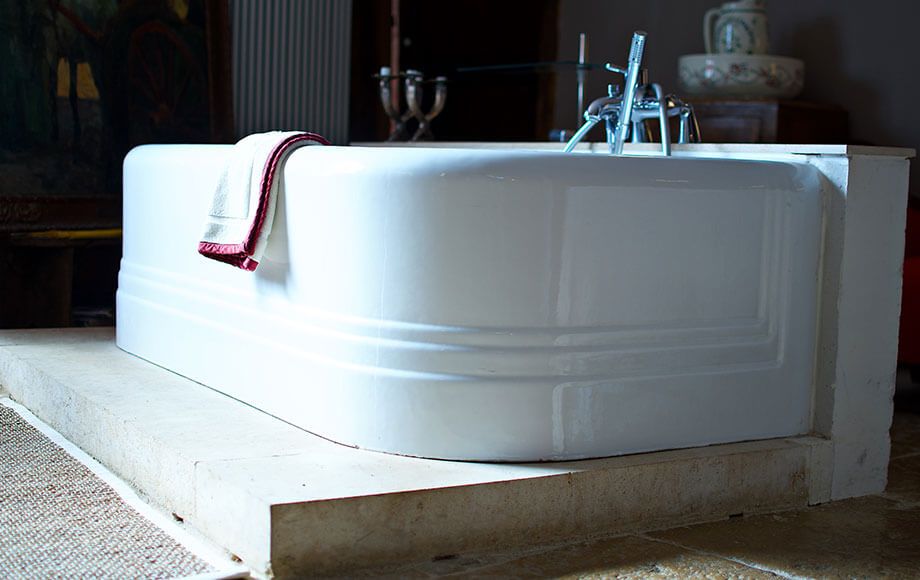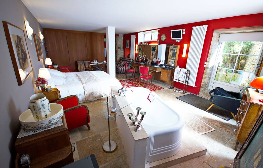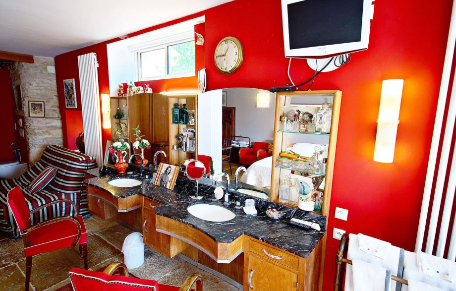 Esprit 1950, meuble de coiffeur d’époque et ambiance contemporaine avec baignoire au centre et wc privé, belles dalles bourguignonnes et située à l’est d’où cette lumière du soleil levant, qui l’éclaire généreusement.